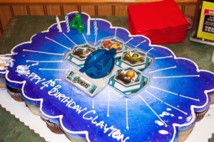 A cupcake cake made serving really easy. You might notice the cake has a blemish on the bottom left hand corner. Clayton’s little brother Dalton needed to taste the cake before the party started. He approved of the sweet blue frosting.