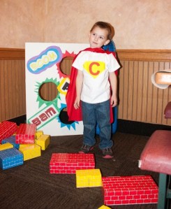 I knew I would need a few activities to entertain Clayton’s guests so I used my crafting skills and made a homemade bean bag toss with some Superhero accents. The kids table was wrapped in paper and accessorized with lots of crayons for the artistic guests and a large pile of cardboard blocks allowed the builders to create walls and knock them down like Superheros do.